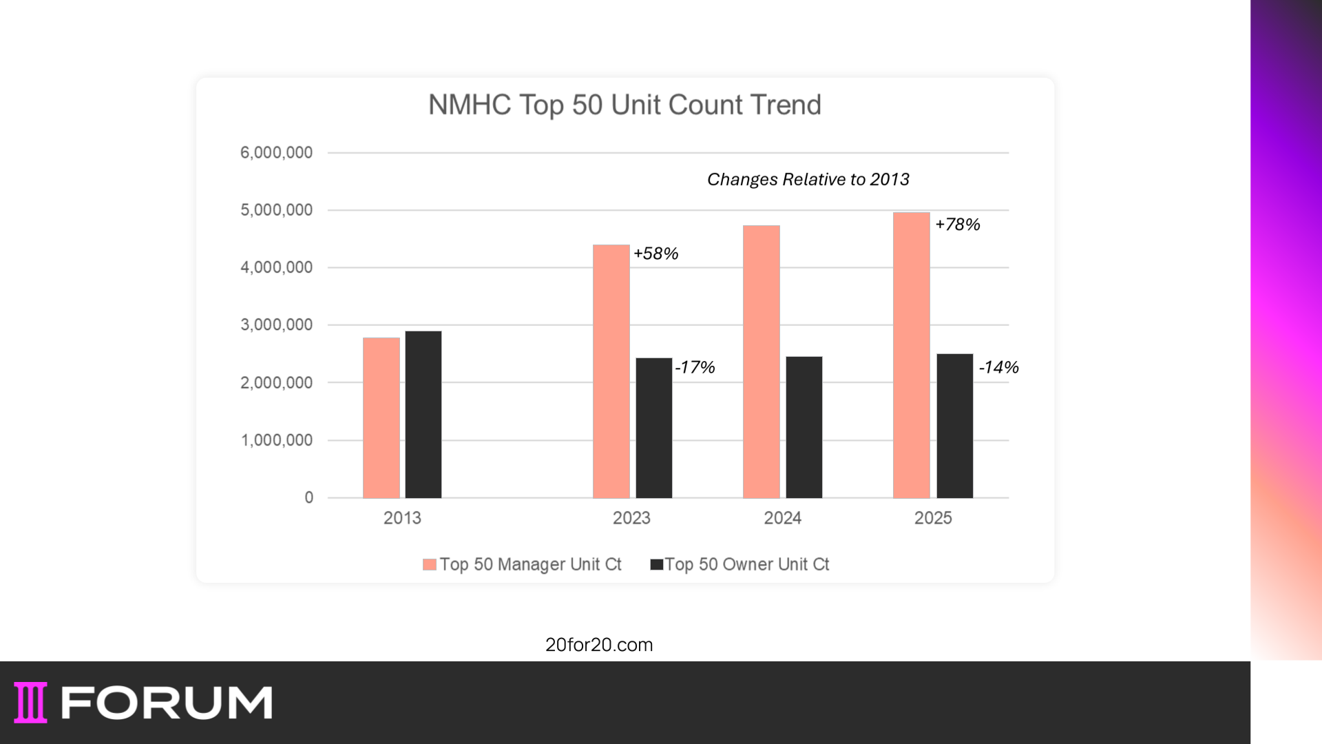 Beveridge showed a sharp contrast in unit trends: since 2013, the average size of the NMHC Top 50 managers has increased by 78%, while the average Top 50 owner has shrunk by 14%.